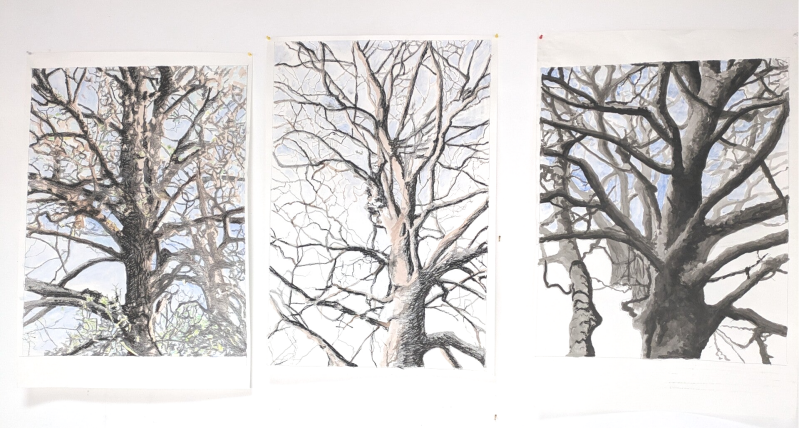 L'image photographique devient dessin par la vidéo-projection. Le format grand-aigle permet de développer les lignes de l'arborescence. D'abord le lavis puis le crayon, la mine de plomb, le pastel pour une gamme de gris vers le noir. La couleur fait timidement son apparition dans les troncs et le ciel, donnant une certaine douceur au dessin.